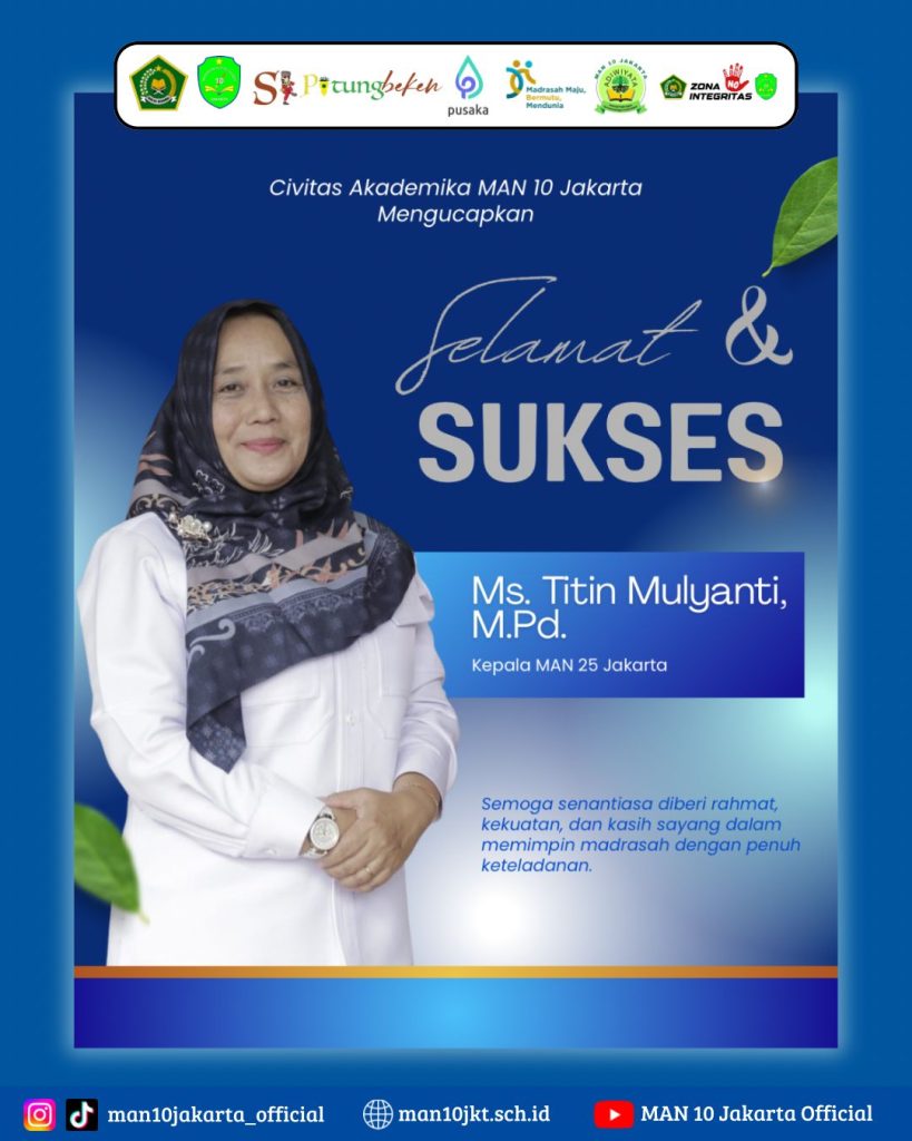 “Selamat kepada Ibu Titin Mulyanti atas pelantikan sebagai Kepala MAN 25 Jakarta Timur. Tentu ini merupakan amanah besar yang harus diemban dengan penuh dedikasi. Selama berkolaborasi bersama beliau, saya melihat komitmen beliau dalam membangun lingkungan belajar yang kondusif dan inspiratif. Semoga di bawah kepemimpinan Ibu Titin, MAN 25 akan semakin maju, inovatif, dan menghasilkan lulusan yang unggul secara akademik maupun karakter,” ujar Dra. Rahmi Indriani dalam sambutannya.
