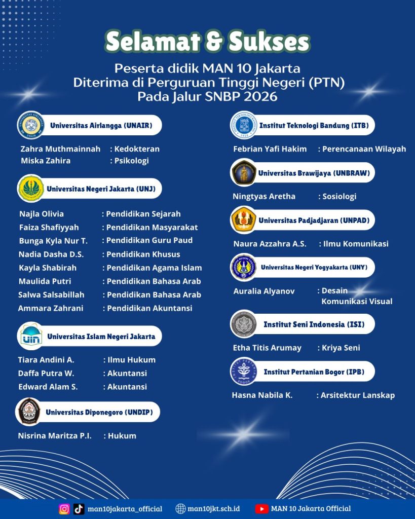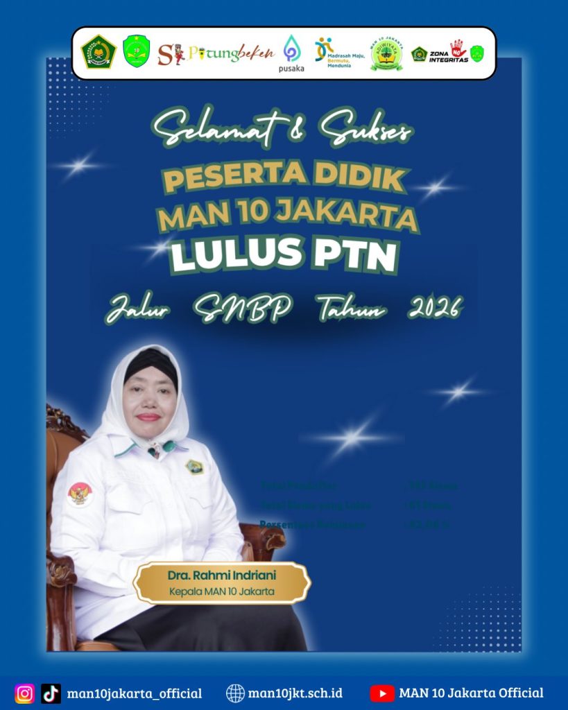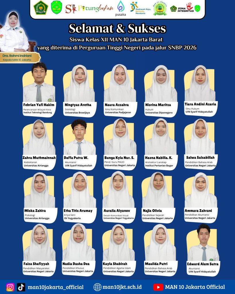 ( Humas MAN 10 Jakarta Barat) Kabar membanggakan datang dari MAN 10 Jakarta Barat. Sebanyak 20 siswa/siswi berhasil lolos ke berbagai perguruan tinggi negeri melalui jalur Seleksi Nasional Berbasis Prestasi (SNBP) tahun 2026.